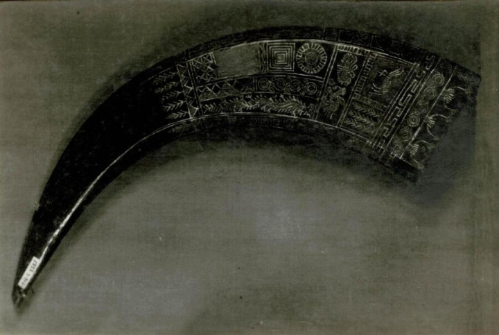 这29件套文物,丢失日期最早的要追溯到1986年1月1日,是一个苗族彩绘渔猎图案酒角,其为牛角加工,是苗族喜庆饮酒用具,角首刻绘虎、鹿、马、鱼、蛇、蜈蚣、蝴蝶、飞鸟及八卦、箭羽、云、雷等几何图案。
