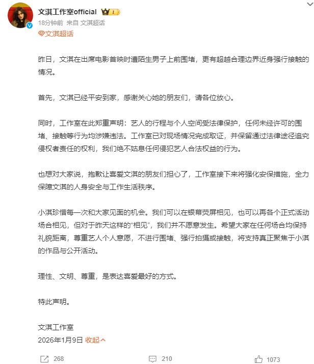 昨日,文淇在出席电影首映时遭陌生男子上前围堵,更有超越合理边界近身强行接触的情况。首先,文淇已经平安到家,感谢关心她的朋友们,请各位放心。同时,工作室在此郑重声明:艺人的行程与个人空间受法律保护,任何未经许可的围堵、接触等行为均涉嫌违法。工作室已对现场情况完成取证,并保留通过法律途径追究侵权者责任的权利,我们绝不姑息任何侵犯艺人合法权益的行为。也想对大家说,抱歉让喜爱文淇的朋友们担心了,工作室接下来将强化安保措施,全力保障文淇的人身安全与工作生活秩序。小淇珍惜每一次和大家见面的机会。我们可以在银幕荧屏相见,也可以在各个正式活动场合相见,但对于昨天这样的“相见”,我们并不愿意发生。希望大家在任何场合均保持礼貌距离,尊重艺人个人意愿,开云体育app不进行围堵、强行拍摄或接触,将支持真正聚焦于小淇的作品与公开活动。理性、文明、尊重,是表达喜爱最好的方式。特此声明。