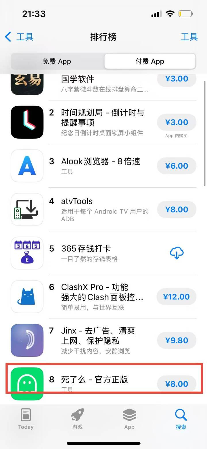 博主晒出的一张AppStore截图显示,一款叫“死了么-官方正版”的App在排行榜位于收费榜55位。不过截至记者发稿,该App的下载量已经跃升至第8位。