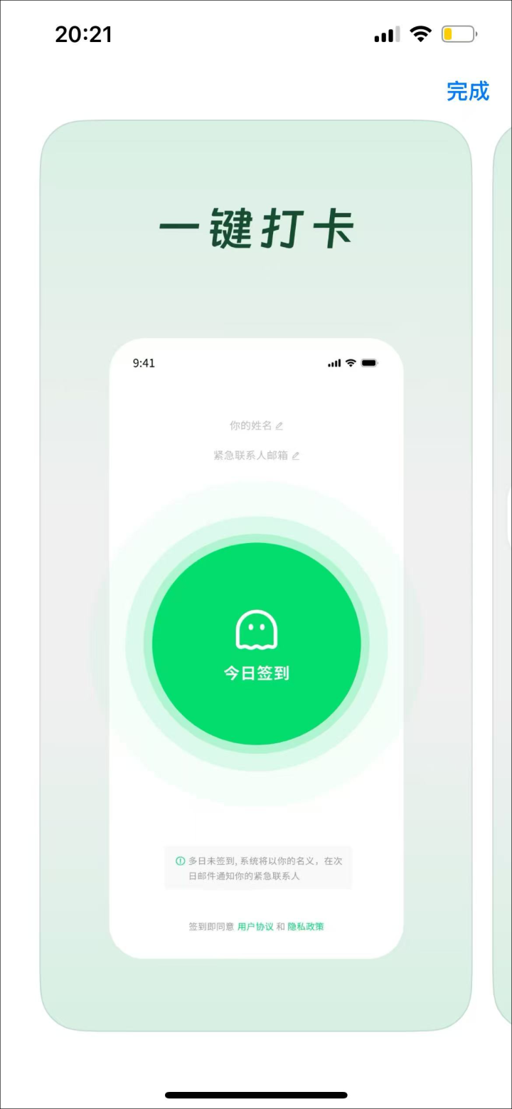 正如其名,这款App的功能非常简单。根据AppStore下载页的功能介绍,这是一款为独居人群打造的轻量化安全工具。软件不需注册登录,首次使用只需填写联系人姓名与邮箱即可。每天打开应用轻轻一点完成签到,后台自动监测状态。